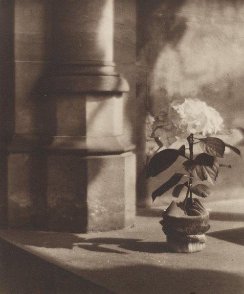 Editor: This is Anselm Kiefer’s "Occupations 1969" in Interfunktionen No. 12. The black and white photograph gives me a feeling of stark performance. What do you see in this piece from a formal perspective? Curator: The strong diagonal created by the arm, juxtaposed against the architecture and organic lines, establishes a tense visual relationship. Consider the textural contrast – the rough bark against the smooth wall. Do you see any significance there? Editor: I hadn't considered the textures quite that way. It gives more depth to a seemingly straightforward gesture. Thanks! Curator: Indeed. The formal elements complicate any singular reading, creating a visual and conceptual friction.
