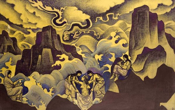 Curator: This is Arkhyp Kuindzhi’s "Sunset Effect," painted in 1890. He employed oil paints here, capturing a vivid landscape. What strikes you about it? Editor: Initially, the exaggerated contrast between the frigid blues and those scorching oranges evokes a profound sense of alienation—it’s almost dreamlike, unsettling. Curator: Kuindzhi's interest lies in the materiality of light, wouldn’t you agree? The texture seems almost secondary to the radiant effects. Editor: Agreed. This landscape, it reads as a commentary on industrialism's incursion into previously untouched landscapes. Those fiery hues – are they sunrise, or the insidious glow of encroaching industry? The choice of Northern Renaissance echoes with their complex iconography, layering our interpretation with that legacy. Curator: Absolutely. He was renowned for experimenting with pigments to achieve extraordinary luminosity. It wasn’t merely about representing light but, one might say, materializing it—to explore chemical interaction between oil-paint components, for example, as he captured light effects so well, but often his paints darkened considerably after only a short time. Editor: The Romantic undertones are inescapable here, as the scene resonates with both sublimity and a premonition of environmental damage. He's prompting us to examine our role within these grand narratives of landscape and progress. Considering the labor required to mine those very materials, from pigment creation to canvas production, each element bears its own colonial weight, too. Curator: His almost theatrical deployment of light pushes the boundaries of realism and romanticism, yes. Perhaps this liminal space is about finding common ground, about bringing industrial practices into dialogue with established landscape aesthetics? Editor: Perhaps, but I view it through the lens of eco-criticism – this landscape mirrors a moment of crisis, revealing the tension between the raw beauty of nature and looming human influence, no doubt an industrialised one, considering Russia's sociopolitical context. Curator: I hadn't considered it in such a dark context! Ultimately, Kuindzhi's choices provoke rich material exploration of landscape through innovative artistic means. Editor: And a powerful, visually arresting socio-political statement, reminding us of our historical and contemporary roles in this ongoing drama.