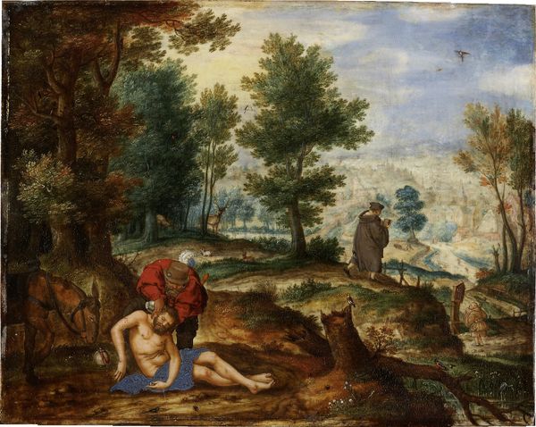 Editor: We're looking at Jan Brueghel the Elder's "Nymphs Bathing," an oil painting located in the Museo Nacional de Bellas Artes in Buenos Aires. The scene is serene, almost dreamlike, yet there is also something unsettling about the hunted game. What can you tell me about how to interpret this juxtaposition? Curator: It’s an excellent observation. Brueghel presents a scene seemingly lifted from mythology – nymphs in a lush landscape – but remember that these idealized visions were produced within very real societal structures. Note the presence of the hunted game. Does that abundance extend to all figures, particularly those less privileged? The power dynamics on display should give us pause. Editor: I hadn’t considered that. So, beyond the surface-level beauty, we need to think about who benefits from this idealized scene? Curator: Precisely! Consider, too, the historical context. How does the male gaze operate within such a scene, and how might it be perpetuating problematic representations of women even within an apparently innocent mythological narrative? Where might we place female agency? Is this an empowering scene, or one of subjugation? Editor: It’s unsettling to realize how such a beautiful painting might mask more complicated themes of power and gender. It almost forces us to reconsider our initial admiration. Curator: Art isn’t separate from reality. Even fantastical paintings engage with – and sometimes reinforce – real-world hierarchies. Brueghel’s work here reminds us that critical looking demands an interrogation of those values. Editor: Thank you, that has really broadened my view. I now see how important it is to examine even the most seemingly idyllic paintings through a critical, socio-political lens. Curator: Absolutely! Art is a powerful mirror and, sometimes, a troubling reflection of societal power dynamics. Looking closely helps us unpack the complexities.