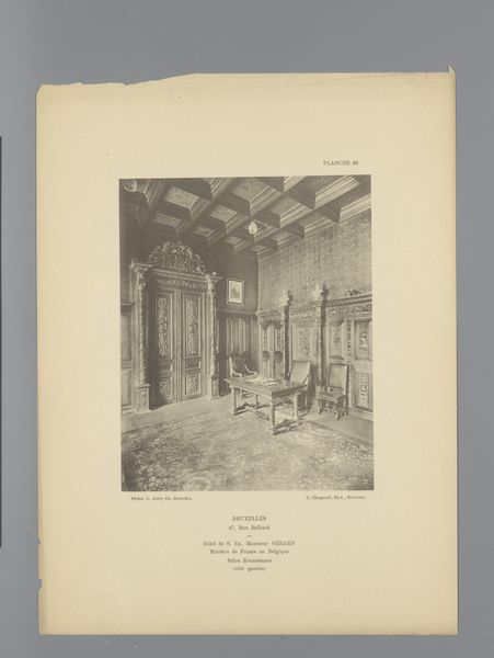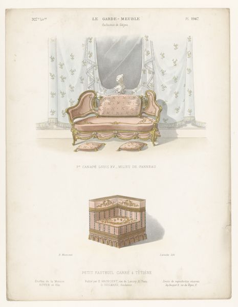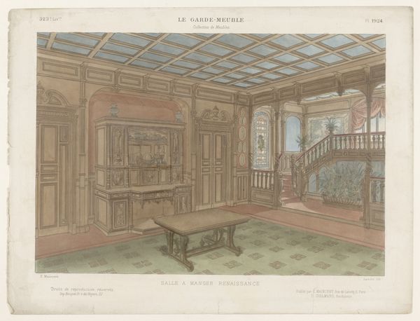This print by Léon Laroche depicts a salon within the Chateau de Montjoyeux in Nantes, likely made using lithography and hand-coloring techniques. The relatively crisp lines and consistent coloration suggest a printmaking process capable of producing multiple copies, indicative of the rise of mass-produced imagery during this era. Note how the visual weight is distributed throughout the image. The relatively sparse arrangement of furniture, from the ornate chairs to the heavy wooden cabinet, contrasts with the densely patterned wallpaper. This contrast perhaps suggests a tension between individual craftsmanship and industrialized production. Consider how much labor and materials were needed to produce the furnishings. Think of the skilled work of the woodworker who made the furniture, the weaver who produced the textiles, and the many other artisans who contributed to the overall design. This image offers a glimpse into the material culture of its time, raising questions about labor, skill, and the evolving relationship between craft and industry.