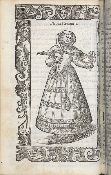 Editor: We’re looking at a print from 1598 by Christoph Krieger, titled "Ongetrouwd boerenmeisje uit Toscane"—an Unmarried Farm Girl from Tuscany. It’s an engraving. I’m immediately drawn to the intricate details of her dress, rendered with such precision. What strikes you most about the composition? Curator: Indeed, the dress is a key element. Note how the artist has used line variation to create a sense of depth and texture in the fabric. Observe the tight bodice contrasted with the skirt’s gentle flare. The dress is highly ornamented but how do you account for the borders surrounding the main image? Editor: They're quite ornate, almost like a frame within a frame. So it adds to the sense of it being a captured moment. What would you say about the role of the borders, aesthetically speaking? Curator: The borders enhance the print's structured composition, while simultaneously creating an ironic dissonance between art and documentation. Notice how these decorations serve a double function as commentary within the print itself. Editor: Interesting point. It’s almost as though the artist is highlighting the artificiality of representation itself. This discussion made me observe all of its aspects; how about you? Curator: Quite. Focusing on the work's intrinsic formal elements reveals a complex interplay of line, form, and space. I am inclined to reconsider art-making by contextualizing, comparing, isolating and abstracting visual forms.