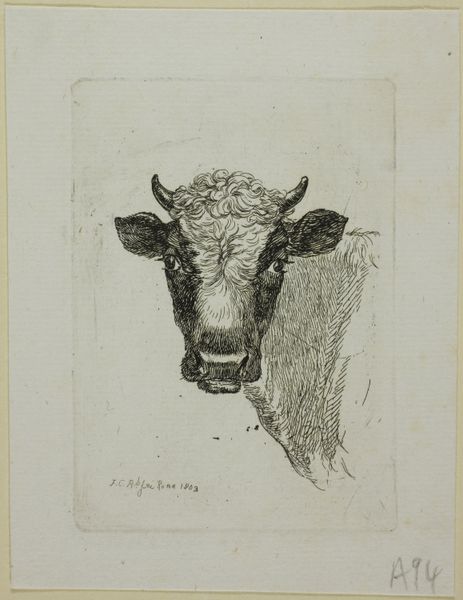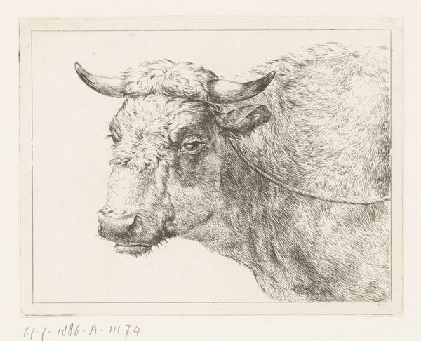Diederik Jan Singendonck created this image of a 'Koekop' or cow's head in 1813 using etching and possibly other techniques. This was during a time of significant political upheaval in the Netherlands, as it transitioned from French rule to the establishment of the Kingdom of the Netherlands. Singendonck’s choice to depict a cow isn't incidental; in the context of early 19th-century Netherlands, rural life and agriculture were central to national identity. The image then becomes a statement about Dutch identity and values in a time of dramatic change. The gaze of the cow, direct and almost soulful, invites a level of emotional engagement. Consider the role of animals in art history, often relegated to pastoral scenes or symbolic roles. Singendonck elevates this cow to the level of portraiture. In doing so, he asks us to consider the cow not just as livestock, but as an individual. It challenges us to reflect on the complex relationship between humans and animals. It's an intriguing reflection on identity, both bovine and national.
