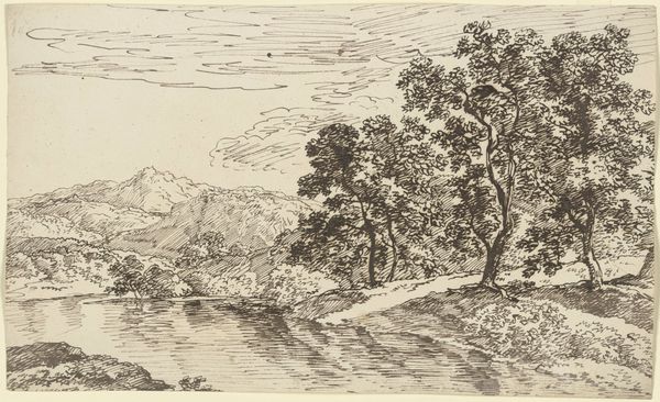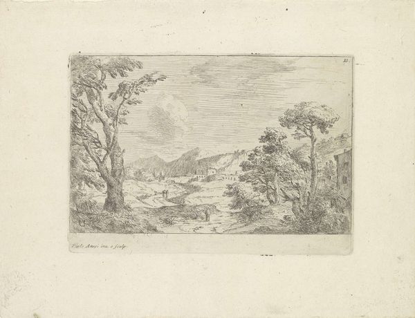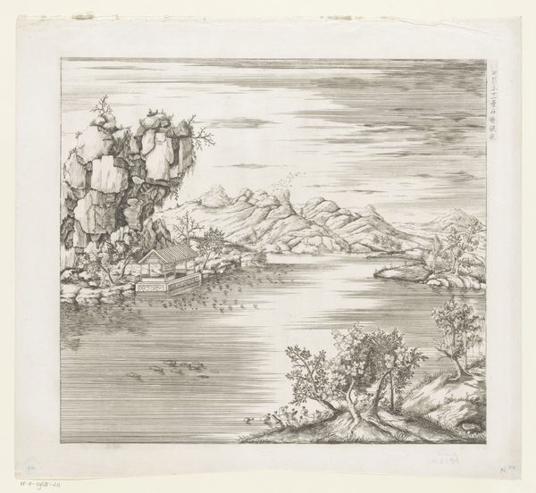 This is Matteo Ripa's etching of a section of the Imperial Summer Palace in Chengde, China. The composition invites us to trace the network of finely etched lines defining the space. Observe the subdued monochrome palette that emphasizes the interplay of light and shadow, structuring the landscape. The tranquil lake dominates the view, flanked by meticulously detailed mountains and architectural structures. Ripa uses line and form to convey a sense of depth and perspective, yet, in doing so, he captures the essence of Chinese landscape aesthetics, focusing on harmony and balance. The carefully constructed composition guides the viewer's eye. The architectural forms are neatly integrated within the natural setting to highlight an idealized vision of imperial life and landscape. Through the artwork's formal qualities, we see Ripa engaged with the cultural and philosophical themes of his time, offering us a glimpse into a world that merges the representational with the symbolic.