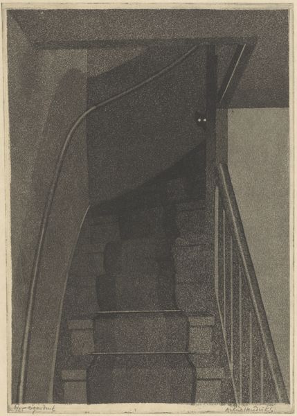 Curator: At first glance, there is a stark and somewhat somber feeling evoked by this image, predominantly from the monochromatic palette and the deeply contrasting blocks of light and dark. Editor: Indeed. What we have here is a print from 1934 by James Blanding Sloan entitled "We Shall Overcome Some Day." Its style draws from social realism. We might read it as graphic art rendered with, what appears to be, linework. Curator: Absolutely. Considering its creation during the Depression era, it strikes me as profoundly evocative, like a visual echo of spirituals or protest songs of the time. Note the starkly silhouetted figures; they are diminutive in scale as they march between those imposing architectural blocks, leading our eyes to an upward, almost heavenly, light. Editor: The figures are repetitive; there’s something undeniably potent in that seriality. Let's consider the printmaking process itself. I would argue that it directly links the artist’s labor to themes of social progress and endurance. Think about it; printmaking allows for multiples, dissemination, almost like a manifesto. It aligns with ideologies concerning democratic access. Curator: Yes, and it seems the visual language used to realize this work relies quite heavily on negative space. See how the bright passage becomes the compositional focal point. Its ascending visual rhythm guides us and invites interpretation; the lines are, in essence, deeply symbolic. Editor: Agreed, and notice also, how this work may signal connections between Sloan and artistic movements like the Black Arts Movement. His interest was less on art as decoration, or art for art's sake. He cared about cultural empowerment. Curator: Considering the socio-political landscape of its creation, Sloan's composition here really captures this interplay between aspiration and structural adversity in just one graphic image. Editor: Exactly, "We Shall Overcome Some Day," the very title of this 1934 print speaks volumes about resilience in the face of structural oppression through both its means and its imagery. Curator: I’m struck anew by the visual interplay Sloan achieves through light and shadow as if capturing both the somberness of struggle and a glimmer of a brighter tomorrow simultaneously. Editor: Yes. We could spend quite a lot more time tracing the thematic resonances across material, process, and era in this small, potent print.