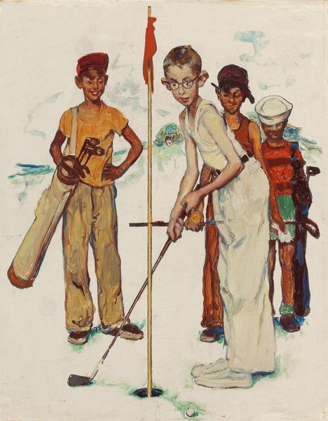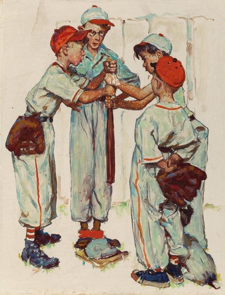 Norman Rockwell made this image, Choosin' Up, most likely using paint. The evenness in the application is incredible, it's almost like the surface has been buffed, the image itself is as smooth as a baseball. The way the boys are gathered, with their hands stacked on the bat, creates a sense of anticipation. Look how the light defines the forms, creating subtle gradations of color. The muted palette—whites, browns, and reds—creates a nostalgic feel, like a faded photograph. But there are also these little details that grab your attention, like the scuffed sneakers and mismatched socks. There's a tension between the idealized world Rockwell is known for and these small imperfections that hint at the messiness of real life. It makes me think of Edward Hopper, in the way he could capture loneliness and a sense of yearning in everyday scenes. Ultimately, this image, like all good art, is a balancing act, it's an ongoing conversation.