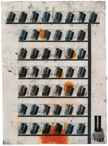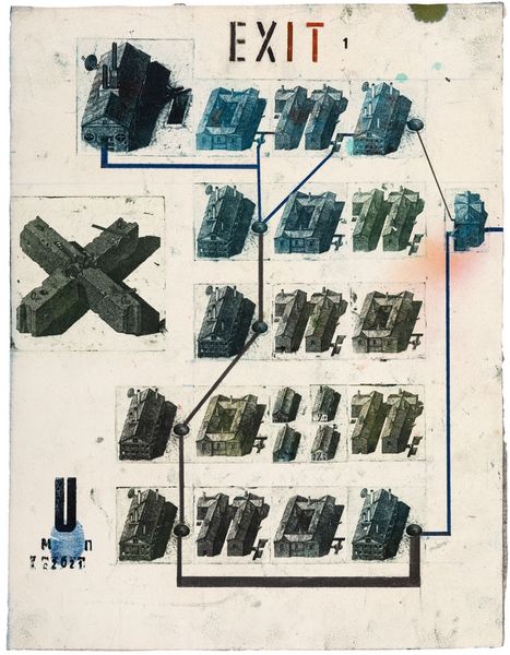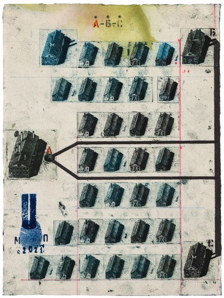 Editor: So, here we have Pavlo Makov’s "A.B." from 2021, a mixed-media drawing combining watercolor and ink on paper. It feels almost like a blueprint, or some sort of coded message, with all those little buildings... What do you make of it? Curator: It tickles my brain in such a curious way, doesn't it? Like a half-remembered dreamscape plotted onto a technical diagram. All these buildings neatly arranged, but then jolted by a flash of red or blue... I see the influence of architectural drawing melded with a surreal cityscape. It’s ordered, but there's a whisper of something else. Do you get the sense of underlying melancholy? Editor: Definitely a melancholy. It’s almost oppressive in its precision. The limited palette, the repetition... it feels intentional. Is there a connection with his earlier fountain works in your opinion? Curator: Good eye! Yes, I believe it explores a similar theme of order versus entropy. In the fountains, you have individual spouts contributing to a unified whole. Here, these individual "buildings", or modules as it were, might build up to form an urban ecosystem…but something is not quite right, and I get that things may break up at any moment. What if each block represents a person in a dystopian state where the living space has been dramatically diminished? Editor: I hadn’t thought of it that way, a diminished urban existence. I was more drawn to the idea of architectural planning. I guess that’s the beauty of art, right? Different perspectives create different realities. Curator: Precisely! It is a shared language where our thoughts shape new perspectives on a theme!