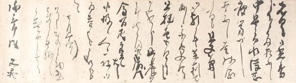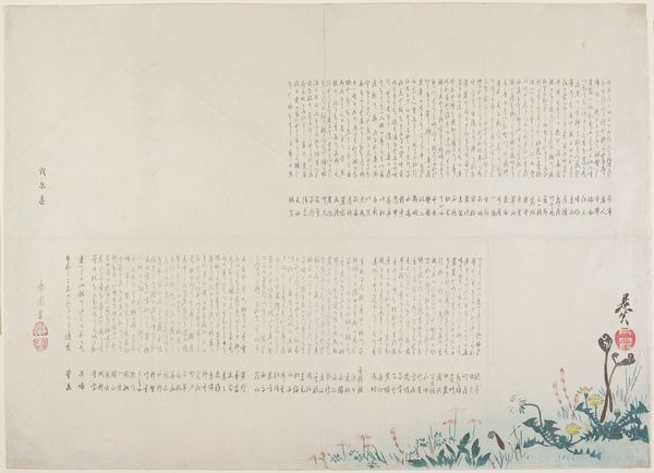 Curator: This hanging scroll, residing here at the Minneapolis Institute of Art, is a piece entitled "One Thousand Character Essay," created around 1785 by Masuyama Sessai. It's crafted using ink on paper. Editor: It's striking! At first glance, it’s overwhelming, dense…almost like a woven textile, but made entirely of tightly packed script. The materiality of the ink bleeds slightly into the paper giving the whole piece a soft, almost faded quality. Curator: Indeed. Sessai was deeply embedded within literary circles and Nanga painting traditions of his time. "One Thousand Character Essay" reflects his sophisticated engagement with Confucian ideals and artistic expression valued by the elite literati. He served as Osaka city magistrate at one point and was close with many important artists. Editor: Knowing he was also a magistrate lends another layer of interpretation. It raises questions about authorship, labor, and what it meant to produce such a densely written piece. Was this text transcribed or wholly composed by Sessai? Is there any indication if he might have had assistance with such a monumental task? It speaks volumes about skill and available labor more than aesthetics alone. Curator: Certainly. Calligraphy was, and remains, more than mere writing, of course. It's a cultivated art form linked to social standing and moral cultivation. Sessai would have been judged by his skill and fluency with brush and ink, especially within official circles. The characters, each carefully rendered, also reference the artist’s adherence to established philosophical structures of Japanese society during the Edo period. Editor: It's also worth pondering the type of paper chosen. How did its absorbency affect the ink flow, drying time, and the overall texture we observe today? Such details highlight the dialogue between the artist’s intention and the raw materials at their disposal, a conversation inherent in every aspect of creating tangible cultural objects. It shifts perspective towards viewing art production less as solely high aesthetic pursuit to a complex interplay of material conditions and creative expertise. Curator: Absolutely. By exploring Sessai's role and the cultural value placed on this piece, we can begin to decode the multiple layers within. The "Essay" is far more than words; it stands as a testament to Sessai’s commitment to artistic excellence, and is itself an expression of political and social influence of Japan. Editor: Reflecting upon the meticulous processes involved provides us insights into the society and culture. It definitely brings a new level of appreciation.
