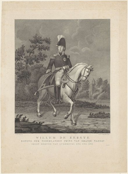 Curator: This is an etching and engraving, "Equestrian Portrait of Colonel José Manso y Solá," crafted sometime between 1810 and 1817 by Antonio Vázquez. Editor: There's something undeniably austere about the image, the monochrome tones lending it a stoic feel. Note how Vázquez arranges the composition to emphasize linear qualities and geometric shapes. Curator: Absolutely. The artist, Vázquez, positions the colonel prominently, astride his steed in what appears to be a proud, almost staged display of power and status, adhering to Neoclassical principles. The landscape is but an accent in service of the sitter, which enhances a very direct semiotic declaration, here, of hierarchy. Editor: Observe, too, how the values are handled—the contrasts aren’t terribly dramatic, yet it has enough contrast to still communicate with remarkable lucidity the subjects status and character Curator: As the name 'Manso' in the title suggests 'tranquility,' the very composure he embodies aligns seamlessly with the traditional archetype of a steadfast, esteemed leader, and that large hat and piercing look surely must signal a memory of Napoleon Editor: It's the detail that fascinates. Notice the minute lines suggesting texture, the subtle gradations rendering form. But I am drawn particularly to the balance that arises from the horse seeming almost as grand and powerful as its rider Curator: The etching provides historical and cultural insight beyond simple representation. This reflects, possibly, the evolving political circumstances of early 19th-century Spain, revealing much of a people at war. This work certainly prompts reflections about visual representations and power during transformative periods. Editor: It leaves me appreciating the craft itself and I wonder if there isn’t also in its restraint, a rather elegant subtlety in design and construction of this particular piece Curator: Ultimately, the enduring presence of works like this proves how much prints, whether political or military, echo through time and provide us ways to grapple with our past.