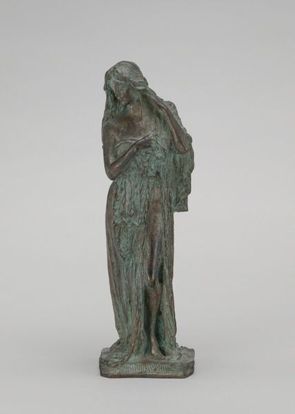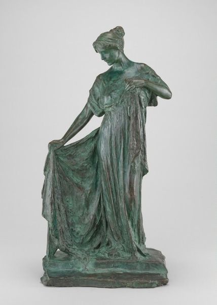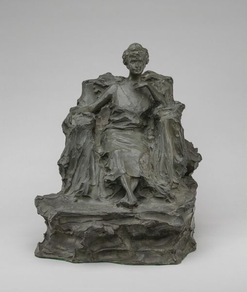 Editor: So, this is Bessie Potter Vonnoh's "A Sketch" from 1902, crafted in bronze. I’m struck by the tender stillness of the woman and child, but also a feeling of something unresolved. What do you see in this piece? Curator: This sculpture vibrates with visual symbols of the mother-child bond, an enduring icon. Look at the woman’s gaze directed downward; in countless artworks, that gesture speaks to devotion and protectiveness. Notice how the bronze catches the light. Editor: Yes, and her robe almost seems to flow around them both, unifying the figures. Curator: Precisely. Garments can symbolize roles or statuses but consider, too, what clothing conceals. What does this covering suggest about vulnerability and intimacy? It evokes earlier Renaissance Madonnas, wouldn't you say? Yet Vonnoh also infuses a modernity. It feels like we are intruding upon a fleeting private moment. Editor: That’s so true. The private moment and the very human connection she represents rings loud and clear even now. Curator: This piece also reveals shifting societal perceptions of women and motherhood at the turn of the century. We observe symbols of sentimentality and strength, a push and pull, as old archetypes meet changing realities. Do you see that tension in the sculpture? Editor: Absolutely, there's strength, but vulnerability, too. I never would have noticed those layers without your insights. Thank you! Curator: My pleasure! It's been great to reflect on these subtle details and cultural echoes with you today.