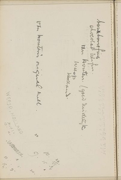 This piece, titled "Naam en adres," or "Name and Address" in English, was created by Cornelis Vreedenburgh, though the medium and exact date elude us. At first glance, we see simply a name and location scrawled upon a piece of paper: J. Soetermeer, River N.Y. Yet, consider this piece of paper, as it appears to have been extracted from a notepad. Are we not reminded of the very concept of documentation? This act of recording a person's identity carries echoes of ancient civilizations, such as the Egyptians and their meticulous record-keeping, or the Roman census. These motifs of the address, the record, appear again and again throughout time. We see it evolve into more complex forms, like a painting or a photograph. Each iteration serves as a cultural touchstone, reminding us of the importance of memory, identity, and the enduring human need to capture and preserve our place in the world. The act of noting the address carries with it a weight of both the personal and the collective.