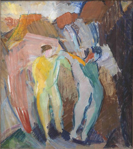 Editor: Ernst Ludwig Kirchner's "Walking Woman with Dog," painted in 1926, uses oil paints to conjure up, I think, a strangely alienated urban scene. It feels quite claustrophobic, doesn't it? With those looming figures and unnatural colours... What's your take on it? Curator: It's fascinating how Kirchner uses those jarring colours and distorted figures, isn't it? Almost as if the city itself is pressing in on them. You get a sense of psychological unease, a world slightly askew. Do you see how the faces are almost mask-like, devoid of real expression? That always struck me. Editor: I hadn't really focused on that, but now you mention it, yes, it adds to that feeling of unease. The way the figures in the background seem almost spectral... are they spectres of his past trauma from the war? Curator: Precisely! That's where the genius lies! He takes Expressionism and injects this post-war anxiety, a sense of lost identity within the growing metropolis. It is as if Kirchner paints the very air of existential angst they breathe. The city isn't just a backdrop; it's another character pressing in on them. Do you get that feeling of pressure too? Editor: Definitely. The colours clash in a way that's not harmonious, almost aggressive. I see that pressure clearly. The dog, too, looks quite isolated. Curator: I like your read on the dog - perhaps a metaphor for the self, trotting along beside life's main players. Consider, what is it searching for? Where is the loyalty directed, eh? A haunting painting! Editor: It is haunting. I didn't think I'd get so much from such a simple-seeming image, but with some insights on psychological elements, and the painting's relation to a traumatic period of time, it unlocked a different way of looking at it! Thanks. Curator: Indeed! Each viewing peels back another layer... a dance between canvas and observer. I hope this encourages more people to tango.