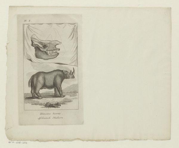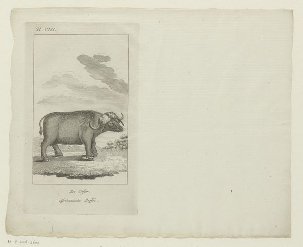 Editor: So, here we have "Hartebeest," a print from 1787 by an anonymous artist. It's an engraving, and the animal is so precisely rendered; it almost feels scientific. How do you interpret this work? Curator: Well, viewing this through a historical lens, the late 18th century saw a surge in scientific illustration driven by Enlightenment ideals. These images weren’t just about capturing likeness; they served to classify and understand the natural world. Think about how the burgeoning scientific societies and museums shaped what kind of images were commissioned and consumed by the public. Does the clean style remind you of anything from the Neoclassical movement? Editor: I do notice how the scene itself seems carefully constructed and stripped to its basics - more concept than reality. Curator: Precisely. The image presents a specimen rather than an animal within a dynamic ecosystem. Ask yourself: what is emphasized? What does this tell us about the social value placed on natural history and taxonomy at the time? How did the art market then facilitate the wide dissemination of knowledge? Editor: That's a great way to look at it. I was so focused on the artistry itself but putting it into its social context makes the image all the richer! Curator: Art's meaning often emerges when we place it within its broader cultural and institutional frameworks. Seeing those connections lets us see a work of art, perhaps, as the product of a place, a time, a culture...