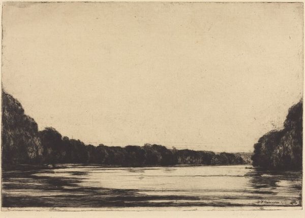 Editor: Here we have "Boerderijen aan een water, vermoedelijk in Noord-Holland," taken around 1900-1910, a gelatin-silver print. I'm immediately struck by how calming it is. The stillness of the water and the subdued tones create such a tranquil atmosphere. What elements of this photograph stand out to you the most? Curator: The image presents a study in tonal relationships and compositional balance. The artist's conscious arrangement of forms – the horizontal expanse of the water bisected by the land, the vertical assertion of the windmill against the flat horizon – generates a subtle visual rhythm. The varying densities of the silver gelatin create a sophisticated monochrome palette. Editor: So, you are focusing more on the structural elements rather than the landscape itself? Curator: Precisely. Consider how the photographer has divided the picture plane: the lower third is dominated by the water, while the upper two-thirds accommodate the land and sky. This division is not arbitrary. Does the lack of human presence shape your response? Editor: I hadn't thought of it that way, but I see what you mean. It really isolates the buildings and natural forms as the subjects. What’s particularly intriguing to you about this composition? Curator: Observe how the placement of the buildings and the windmill punctuates the horizon line, creating points of visual interest that guide the viewer’s eye. The reflection of light in the water is a critical compositional element, which enhances the overall pictorial effect. Editor: That's a different perspective than I had, I was caught up in the imagery of the landscape! Thanks for sharing! Curator: Indeed. A careful formal reading can often unlock unexpected layers of meaning within a seemingly straightforward image.