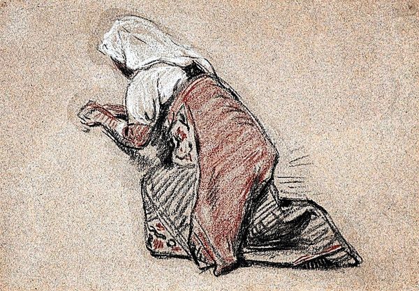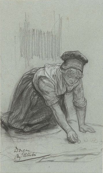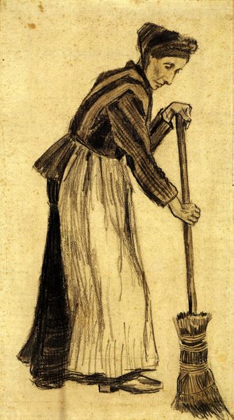 Curator: Vincent van Gogh created this charcoal drawing, “Peasant Woman Bending Over,” in 1885. It's currently held at the Kröller-Müller Museum in the Netherlands. Editor: My first impression is one of weary labor. The bent posture and earth-toned palette really convey a sense of physical toil and perseverance, a connection with the soil itself. Curator: Absolutely. Van Gogh’s artistic focus at this stage was profoundly shaped by his empathy for the working class. He sought to depict their reality with an unvarnished truth. This work, especially given the era, aligns with the Realism movement’s agenda to present accurate representations of everyday life and its harshness, diverging from romanticized depictions. Editor: You can certainly feel the weight of that historical context. But also, notice how her form nearly blends with the ground, mirroring a life intimately tied to the land. Her clothing, heavy and draped, almost merges with the earth she’s working on, reinforcing this visual link. What could the clogs possibly signify here? Curator: Ah, that's intriguing. In this period, wooden clogs were common footwear for peasants due to their affordability and durability. Their presence is less symbolic and more practical: clogs were essential tools. However, Van Gogh uses this simple object to dignify and honor that hardscrabble life. They are as necessary to her labor as her hands. Editor: A compelling reading! And the downward curve of her spine, the implied weight in her shoulders – these resonate with a universality beyond the historical. It speaks to the timeless human condition, our relationship to the work that sustains us. Curator: Indeed. This work predates his more expressive, colorful paintings, but it lays the foundation for his artistic compassion. The starkness of the charcoal captures the very essence of labor and social reality. Editor: It's been enlightening to delve into this lesser-known piece. The visual motifs speak clearly about societal context. Curator: Agreed. Analyzing its visual rhetoric helps us see how it served as a powerful form of social commentary.
