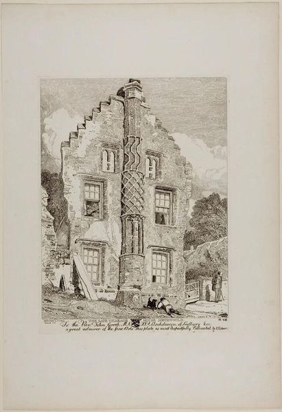 Curator: What strikes me immediately is the crumbling facade—a stark visual representation of decline and decay. Editor: Indeed. This is "Large Tail-piece Representing the Apse Windows of the Church of Saint Taurin, Evreux" by Richard Parkes Bonington. The print depicts not just architectural structure but the human element intertwined with it. Curator: The figures seem to be interacting with the ruin, perhaps utilizing its resources. It makes you consider the labor involved in both its creation and its present state of disrepair. Editor: Notice how Bonington uses line and light to emphasize the texture of the stone, creating a sense of depth. Curator: Absolutely. It’s almost as if the building is being consumed by the passage of time and the natural world. Editor: A poignant reminder of the temporality of human endeavor. Curator: Yes, Bonington captures the tension between permanence and transience perfectly. Editor: It leaves you to ponder on what the Church once represented.