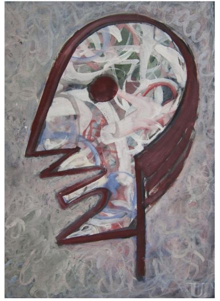 Vilen Barsky created this artwork titled "Female Image" using watercolor. The composition is immediately striking with its bold contrast between the blue figure and the dark lines, set against a muted grey background. This interplay evokes a sense of depth and tension, drawing the eye into the subject's profile. The structure relies on the stark contrast between light and shadow, which invites contemplation on how identity is constructed and perceived. This division creates a semiotic interplay where blue and black act as signifiers. The blue possibly symbolizes purity or emotional depth, while the black may represent the unknown. The image challenges traditional portraiture by reducing the female form to essential shapes and lines. As you consider this piece, think about how the composition invites us to question the nature of representation itself.