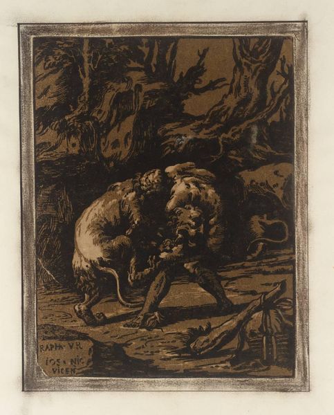 Curator: Esq Tom Phillips, born in 1937, created this intriguing print, titled "Canto XXX," which resides in the Tate Collections. My first impression is a feeling of unease, almost claustrophobia, from the density of the scene. Editor: The raw, almost brutal, textures contribute to that feeling. The printmaking process itself, with its reliance on physical labor and chemical reactions, mirrors the harsh landscape depicted. Curator: Absolutely. We see figures seemingly trapped within this rocky terrain, perhaps reflecting themes of isolation or struggle, even a commentary of the plight of the male figure in society? Editor: Considering Phillips's broader engagement with literary themes, particularly Dante, it is possible to read this piece as a reflection on existential angst and the human condition, particularly through the lens of the original text. Curator: That reading highlights the intellectual labor involved in both the creation and interpretation of the work, and what is really on display here. Editor: It's fascinating how the materials and methods shape our understanding of such complex ideas. Curator: Precisely. This print definitely offers much to ponder. Editor: Indeed. Thanks for this glimpse into it.