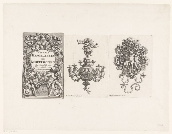 This print, "Kandelaars en kroonluchter met ruiter en cherubijn" by Anthonie de Winter, presents three intricate designs for chandeliers and sconces, rendered with meticulous detail. The composition is immediately striking for its elaborate ornamentation and theatrical flair. The designs showcase a dense layering of motifs, from cherubic figures and equestrian scenes to ornate foliage, all rendered with a precise play of light and shadow. De Winter's use of line and form creates a dynamic tension between the solidity of the objects and the ethereal quality of the light they would cast. The artist challenges traditional notions of functionality, instead drawing on a semiotic system of signs to convey wealth, status, and cultural sophistication. The destabilization of simple utility in favor of elaborate display reflects broader cultural shifts in the 17th century, where objects became powerful symbols of identity. Ultimately, De Winter invites us to consider how design can function as a form of cultural and philosophical expression.