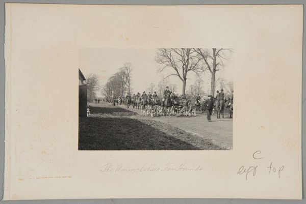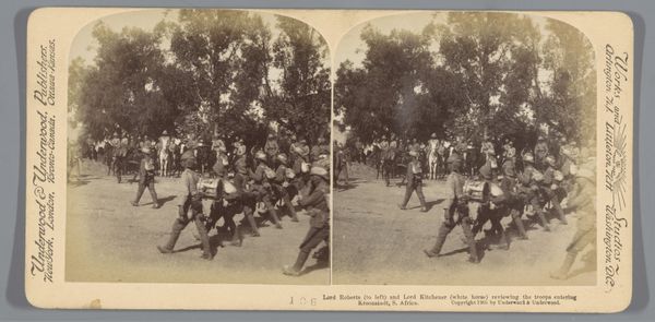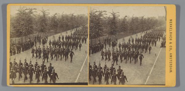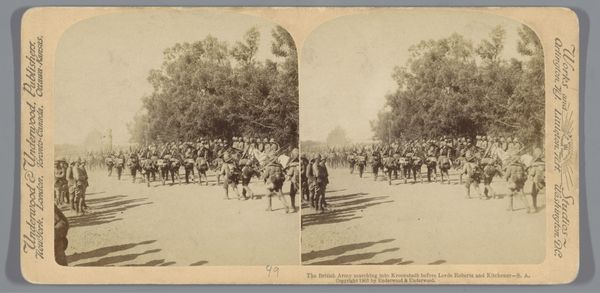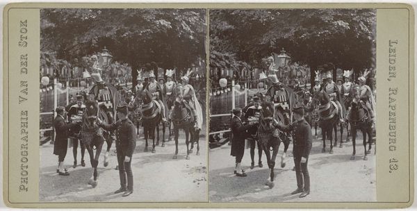 Curator: Looking at this photograph, titled "Pestbestrijding te Malang: transport van het Clayton apparaat", taken sometime between 1900 and 1935 by Neville Keasberry, what catches your eye first? Editor: The stark line of men immediately draws my attention. They seem weary, and their stooped posture and the ropes connecting them evoke a sense of forced labor or communal burden. There’s a somberness hanging over this scene, a heaviness that permeates the image. Curator: That's a powerful initial response. It's interesting to consider the image within the context of its creation. Keasberry, photographing in Malang, Java, captures not just a street scene, but also the dynamics of colonial control inherent in public health campaigns like pest control. This photograph, reproduced as a stereoscopic image, was very likely circulated back in Europe to demonstrate and consolidate an idea of Dutch progress and modern rule in the colony. The photograph thus functions as propaganda. Editor: Yes, you can certainly see the potential for propagandistic use here, creating an image of a well-ordered project for a European audience. But it doesn't erase that primal image of a collective of workers bound in some way. The apparatus in the background looks unwieldy. We also get that impression of heavy labour from this symbol. Do we know what kind of pest control this apparatus delivered, and does that act, or process itself, offer insight into the power dynamics at play here? Curator: Clayton machines were used for fumigation, employing sulfur dioxide to eliminate insects and vermin. Within the image, it is placed upon a tall raised wagon with men operating at the top. What might such elevation signify, literally looking down on those in front of the mechanism who must be tethered to its passage through the urban terrain? Editor: The height of the machine definitely speaks to control, elevating both the apparatus and those operating it. Then consider the symbolism of pest control itself – defining who and what is desirable and who/what isn’t. And sulfur! The smell, its biblical association with hell... It is a forceful purification symbol imposing not just physical change on this environment, but something almost like moral cleansing too. The local men tied to this alien monster as some imported European ideal of "cleanliness" progresses across the land. That feels like a potent encapsulation of the colonial dynamic. Curator: That interplay of symbols makes this photograph much more than just a record of pest control in Malang. It is an image of the relationship between those managing Java and the workers within its landscape. Thank you, it's given me new things to consider in its historical and visual record. Editor: A layered, unsettling, but ultimately telling image of that particular moment.