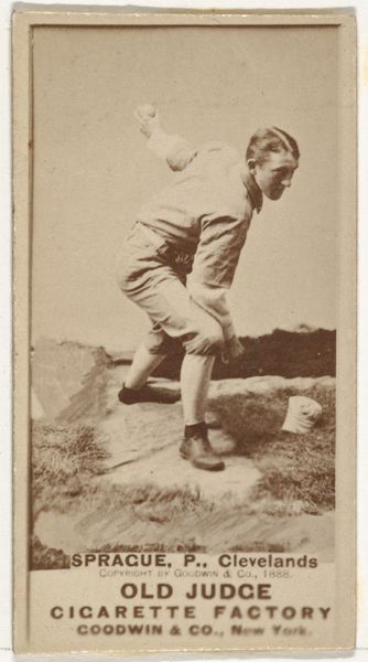 Curator: This is a baseball card from the "Old Judge" series produced in 1888 by Goodwin & Company. It features August H. "Gus" Krock, a pitcher for the Chicago team. The card itself is a print based on a photograph, a relatively new medium at the time. Editor: There’s an oddly unsettling quality to this card. The sepia tone flattens the image, and Gus looks isolated and strangely vulnerable against that indistinct background, as though he’s alone on stage with no crowd, as opposed to on a field. The man looks thin too, and the uniform looks like his dad's hand-me-downs. The advertisement underneath him almost overwhelms him! Curator: That isolating effect you describe is intensified, I think, by the figure's sharp contour and the fairly simple composition; this really enhances the almost geometric placement of his body in relation to the lettering, to its hard edges. The way his limbs are posed in almost perfect angles lends a peculiar formal quality. We might look to artists of the period such as Degas for this type of rendering that freezes a body’s momentum. Editor: Right, but Goodwin & Co. sought to associate the rugged athleticism of baseball with the suave appeal of cigarettes—linking Krock to this particular form of commercialism feels, at best, ethically murky given what we now know about the marketing and production practices of that time. Moreover, mass culture representations of athletes also promoted specific notions of masculinity. It makes you wonder how inclusive, or exclusive, turn-of-the-century ideals of American masculinity and athleticism actually were. The very framing of this artwork implicates us in such debates, whether we want it to or not. Curator: Agreed, such analysis brings a critical historical depth to how we can understand images like these. The subtle tonalities, framing, and Krock's elegant pose all come together to transform this very particular image from ephemera into an icon. Editor: So what starts as a sepia-toned piece of Americana, on closer viewing reveals multiple intersecting threads related to commerce, health, sport, and the very construction of identity. It certainly does provide a glimpse of a bygone era and its contradictions.