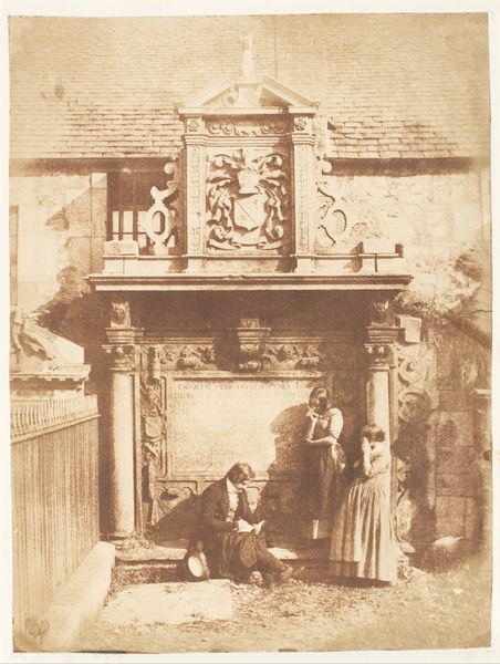 Editor: We're looking at "Edinburgh. Greyfriars' Churchyard," a daguerreotype taken by Hill and Adamson sometime between 1843 and 1847. It has such a haunting feel to it. A figure stands in front of a rather imposing monument. How do you interpret this work? Curator: What strikes me immediately is the way Hill and Adamson are using this new technology, photography, to engage with a very specific cultural narrative. Consider the rise of Romanticism in the early 19th century and its fascination with ruins, the past, and the sublime. Here, they aren't just documenting a place; they're crafting an atmosphere, leaning into the monument’s implied history to resonate with a wider audience familiar with those Romantic ideals. It's also interesting to consider how accessible graveyards were as public spaces, especially for artistic and photographic endeavors. Editor: That's a good point about Romanticism. Do you think the placement of the figure is important to the overall impact? Curator: Absolutely! Notice how the figure isn't centered, isn’t a main focus. Their subdued presence contributes to the somber mood. Consider too that this is a deliberate construction—they posed their subject. This begs questions about staging identity, both of the person photographed and of Scotland’s constructed past for outside consumption. Hill and Adamson were very aware of creating a narrative. Editor: So it's not just a record, it's an argument? Curator: Precisely! It is contributing to an understanding, almost a marketing, of Scotland through the relatively new medium of photography, thus giving it even more ‘reality’. The choice of subject matter, composition, and even the technical limitations of the daguerreotype process—its unique tones—all play into the reception. Editor: I hadn’t really thought about it in terms of constructing identity and marketing Scotland. It seems obvious now. Curator: Early photography has such richness in how we perceive both past and present. Always good to reconsider assumptions and question everything!
