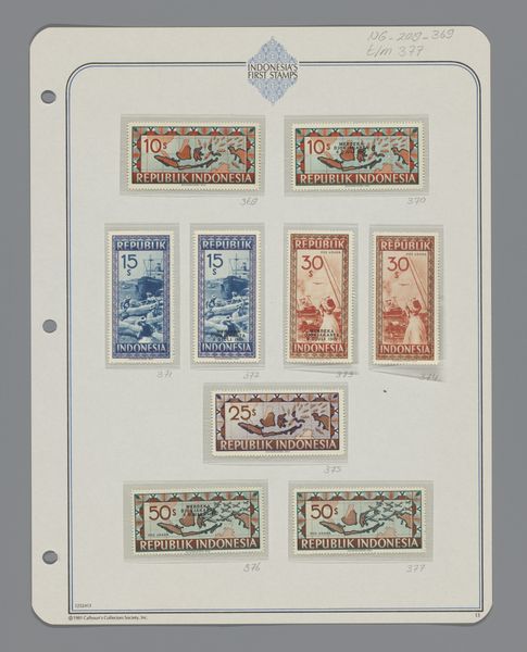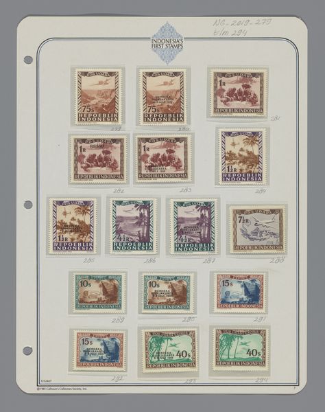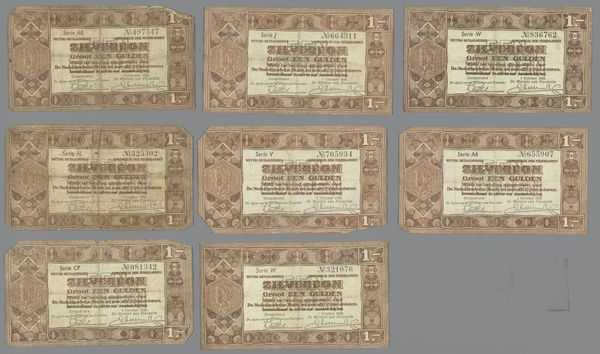 Artist: Looking at these sheets of pale peach, they remind me of faded postcards or old theatre tickets. Art Historian: These are actually printing proofs for a one Gulden banknote, "Een Gulden," likely from around 1945. The artist is Thomas De La Rue & Company Ltd. This belongs to the graphic arts, specifically as a print, and might also carry undertones of Modernism in its style. Artist: Printing proofs, interesting. So these sheets weren’t meant to circulate but to demonstrate the note’s design to a client, maybe? I can almost feel the nervous anticipation of waiting for approval, the pressure to get it just right. The sameness, though, strikes me... rows upon rows, suggesting the machine production, devoid of any spontaneity or feeling. Art Historian: Exactly! These proofs reveal so much about the industrial process of currency production. And while you sense a lack of spontaneity, consider the immense control needed to reproduce that exact portrait with such consistency across hundreds of sheets. These banknotes represented postwar efforts toward economic and social reconstruction. Currency, and its design, has always been a way for countries to show sovereignty. Artist: Reconstruction…so this peach hue hints not at nostalgia but at a deliberate kind of...order? Like, “Here is our money, neatly organized.” Art Historian: Indeed! It signals the return of order after chaos, using recognizable imagery. See that woman's portrait recurring over and over? By placing this symbolic image within everyone’s reach, she, and by extension the state she represented, would re-establish its power. And this new currency demonstrates that Netherlands is on the path towards prosperity, it will thrive economically. Artist: I get it! They’re not just making money, they are constructing confidence. Well, in terms of its layout, the portrait seems stiff to me but the details, on the other hand, the intricate ornamentation around the denomination is remarkable. It shows, also, a moment of calm in this time of turmoil that had passed by recently. Art Historian: Indeed! This work reflects its historical setting, by displaying the Dutch aim to restore stability by creating confidence. That is why such detailed images are used! Artist: Okay, looking at this artwork now, I see more layers, that those peach sheets have embedded into its very fibers resilience in those fragile economic recovery processes.