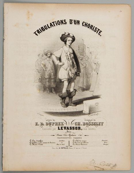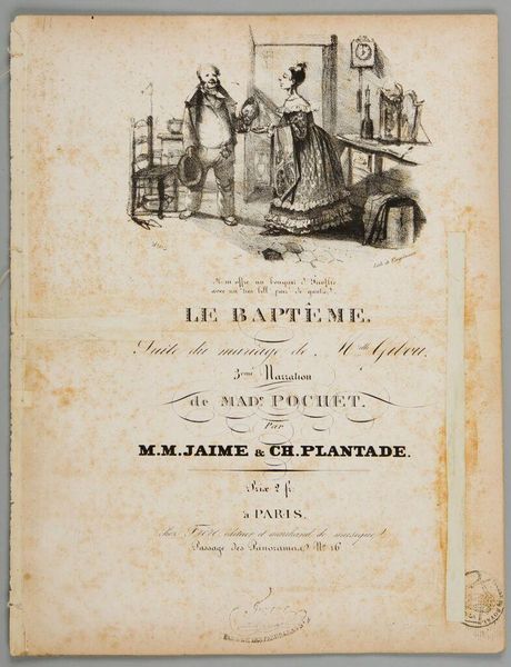 Editor: This is "The Stage Coach Stop" or "Departure and Arrival," the cover of sheet music by Victor Coindre. It feels like a snapshot of a bustling moment. What symbols do you see at play here? Curator: The stagecoach, of course, is a powerful symbol of transition. People entering and exiting represent life's journeys, the choices we make, and the constant state of flux. The individuals themselves, how are they dressed, and their expressions? What do they tell us about that period and the collective memory? Editor: I hadn't considered the clothing as symbolic, but it definitely signifies social class and even aspirations. Thank you! Curator: Indeed, visual culture embeds meaning. Reflect on how seemingly simple images can speak volumes across time.