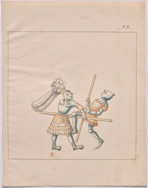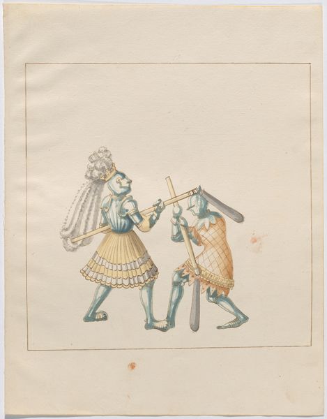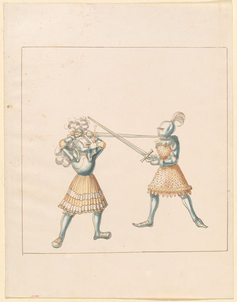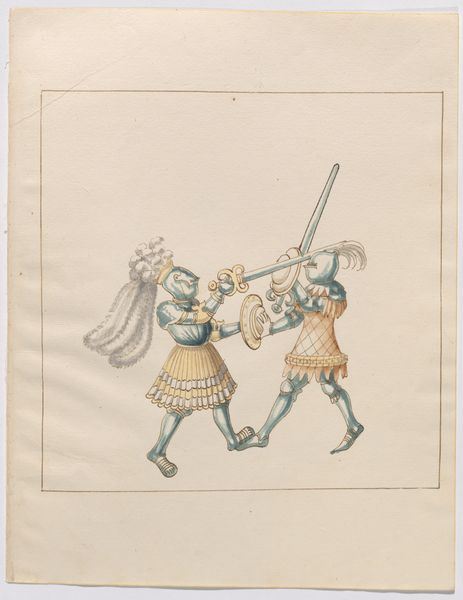 This watercolor on paper, "Foot Combat with Daggers", by an anonymous artist, depicts two armored figures engaged in a fierce duel. Likely produced in Europe, perhaps Germany, during the late medieval or early Renaissance period, this image offers a glimpse into the martial culture of the time. The combatants, clad in full plate armor, wield daggers in a close-quarters struggle. The attention to detail in the rendering of the armor suggests a society deeply invested in military prowess and the technology of warfare. The very concept of the duel has a deep social meaning. The absence of identifying crests or heraldic symbols may indicate that the artist intended to depict a generic combat scenario rather than a specific historical event. Alternatively, the work may be a study for a larger composition, or an illustration from a manual on combat techniques. To better understand this work, one might consult contemporary treatises on swordsmanship, accounts of tournaments and other forms of ritual combat, and studies of the development of armor and weaponry. The meaning of such images is highly contingent on their cultural and institutional context.