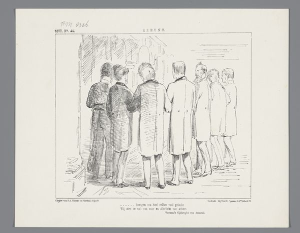 This is a political cartoon made in 1869 by Johan Michaël Schmidt Crans, a Dutch artist. Titled "Spotprent op de controle van de budgetten van de ministers", the image shows a group of men who seem to be politicians. The cartoon satirizes the power dynamics within the Dutch parliamentary system. The men holding signs that read "Begrooting" or budget, suggesting the Liberal majority in the House of Representatives are reviewing the budgets of ministers, or are the ministers themselves. The image uses visual codes to depict the political climate of the time and comments on the social structure of the Netherlands. Understanding this artwork requires research into the political landscape of the Netherlands in 1869, exploring the dynamics between the liberal majority and the ministers. The study of political cartoons offers valuable insights into the social and institutional contexts of the time.