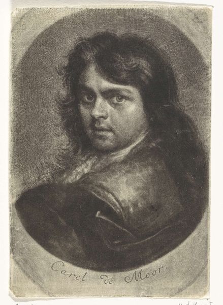 Curator: Oh, this portrait just vibrates with presence. Aert Schouman created "Buste van een man," sometime between 1720 and 1792. What do you make of him? Editor: I see a real emphasis on craft here. The charcoal lends a smoky texture, like rough cloth. Did Schouman use chalk and pencil too? How would that have impacted the economics and process? Curator: I imagine the artist reaching into some vulnerable space when trying to reflect the sitter. The portrait is softly modeled, more implied than strictly defined. A shadowy Baroque ghost! I imagine the feel of charcoal under my own hand… Editor: It's true—this emphasis on portraiture, often highlighting wealthy male subjects, solidified a certain market for art as commodity and cultural capital. Was Schouman reliant on such figures for income, or was the portrait-making activity tied into workshops for artisan craftspersons? Curator: I agree. Yet, looking at his mouth and squinting eyes, he might even possess some internal skepticism! Or even wit? I find a playful depth there, an invitation... Editor: The means of production are especially intriguing considering Schouman's attention to fine detail juxtaposed against the limitations imposed by a charcoal or graphite medium. How can we reconsider this period through the lens of available raw materials for artistic exploration? Curator: The textures alone capture my senses. I picture the paper's gentle tooth resisting his tools, making him work just to hint at the textures. Editor: Yes, thinking of those subtle grades in tonality is interesting, especially from a purely material standpoint. Curator: He's intriguing; Schouman’s "Buste van een man" offers a space of open thought for our current age to meet with that era. Editor: It also really grounds Baroque portraiture with such visible craft in plain sight, beyond those silky, glossy surfaces that we tend to automatically connect to the styles and subject matter of that age.