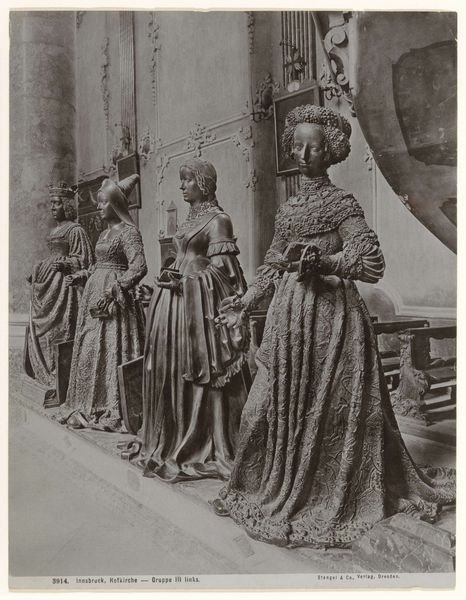 Curator: This gelatin-silver print, entitled "Indonesian Women," was captured by Dorothea Lange in 1958. What catches your eye initially? Editor: Well, I'm immediately struck by the serenity. Despite the implied physical effort of carrying those trays, there’s a composed grace, an almost meditative quality, in the women's expressions and posture. It’s quite stunning. Curator: Absolutely. The upward trajectory, the women ascending the steps, perhaps to a temple, carrying offerings... the symbol of ascent resonates deeply across many cultures and spiritual traditions. We're invited to contemplate the sacred, the journey. Editor: Right. And there's something wonderfully contrasting about the bare feet on stone steps combined with these ornate trays and garments. It merges the everyday with the ritualistic. Curator: Indeed. Look closely at how Lange uses the monochrome. It lends the photograph a timelessness, while also subtly emphasizing the textures of the stone, the fabrics. The gray scale focuses us on form and light. The lack of vibrant color forces us to truly look, don't you think? Editor: It does. It makes it less about surface aesthetics and more about the weight of the tradition, the weight of those offerings, both literally and metaphorically. It almost feels… sepulchral? In the most respectful sense, of course. Curator: A fitting term. These are living icons frozen in time by Lange's insightful gaze. It highlights the persistence of tradition. Even as Indonesia moved forward as a nation, this timeless culture prevailed. It suggests a continuous cultural heritage—memories and symbols coexisting within these individuals. Editor: Lange captures that quiet power, doesn’t she? It reminds you that beauty exists in work, devotion, ritual… that these women *are* the tradition, embodied and enacted. Their elegance, their steadiness - it gives you hope. Curator: It certainly offers a potent meditation on devotion, duty, and the enduring power of cultural symbols. Editor: It has encouraged me to view familiar iconography as vibrant embodiments of cultural narratives. I'm inspired to look beneath the surface.