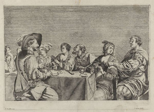 Curator: Look at this intricate engraving titled "Muzikanten en drinker in een herberg," or "Musicians and Drinker in a Tavern," made in 1828 by William Young Ottley. What’s your first impression? Editor: Pure, unadulterated revelry! It’s like a frozen moment from a rowdy pub, teeming with life – maybe a bit too much life for some, ha! Curator: Indeed. What I find striking is how Ottley uses seemingly simple lines to create such a sense of depth and chaotic energy. You can almost hear the music and smell the stale beer. Editor: You nailed it. I'm drawn to the central figure hoisting that monumental glass. It feels symbolic, almost a defiant gesture against...well, against everything! Notice the small dog: a detail or a symbol? Curator: It definitely reads to me as a wink to Baroque genre paintings that idealized the lower classes, elevating their ordinary, sensory experiences to grand symbolic themes. Think of Bacchus. Editor: So the drinker could be seen as a Bacchus figure then, a personification of merriment. The musical instrument player sits beside him as well: they become players on the stage of desire. Yet that dark foreground...does this imply darker meanings too? Curator: Possibly! A commentary on excess perhaps? On one hand, the dog, for example, traditionally symbolized loyalty, but here it looks like it wants to leave that room now, but that detail is offset by its awkward positioning beneath the central figures. Editor: I can't help but wonder, though, what were Ottley's intentions. Was he simply documenting a scene, or was he critiquing it? The composition leaves me feeling delightfully uncertain. I see my former student parties, their unadulterated energy of life! Curator: Right? Art, in its best moments, mirrors our experiences back to us. Thanks, this engraving provides us an excuse to linger in that blurred state a little longer!