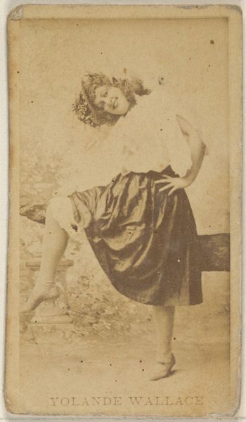Curator: Allow me to introduce “Murdock, from the Actors and Actresses series (N171) for Old Judge Cigarettes," a rather unique albumen print created between 1886 and 1890 by Goodwin & Company. You’ll find it residing here at the Metropolitan Museum of Art. Editor: It has this languid, almost melancholy feel, doesn't it? The pose is so deliberately artful, like a Victorian-era influencer striking their best pose. It’s all muted sepia tones and a general air of staged romance. Curator: Indeed. As an albumen print, the gradations within that sepia tonality are significant. Notice the composition: Murdock is leaning, seemingly exhausted but artfully so. The diagonal lines formed by her body and the fence create a dynamic tension against the otherwise static backdrop. Editor: She looks a little world-weary, almost. Like she’s seen one too many curtain calls, you know? The clothing and draped fabrics give it a theatrical flair. It speaks to a life performed. Curator: The performance is key. These cards were meant to be collected and traded, miniature portraits of fame circulating within a burgeoning consumer culture. The stark contrast between her face and the darker costume focuses the eye, reinforcing her celebrity status. Editor: There’s something slightly subversive about the whole thing, too. Placing this rather pensive image on something as prosaic as a cigarette card? It's like mixing high art and low commerce. Do you think that's intentional? Curator: It is a purposeful collapse of the divide between art and advertisement, typical of the era's commercial prints. Its impact lies in its function: disseminating images widely, blurring boundaries between the stage and everyday life. It asks us to consider the semiotics of fame, perhaps, as they were just forming. Editor: Thinking about it, this humble cigarette card might be more honest than a modern Instagram post. She just IS in it, you know? And there’s this very poignant awareness about it all... Anyway, it’s nice when things connect after so long, even if the connection started as someone selling cancer sticks! Curator: A fitting epilogue, reminding us that context shapes our understanding and appreciation. Each gaze offers fresh interpretation to these layered impressions within our cultural archive.