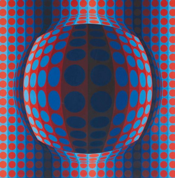 Curator: Ah, yes, VÉGA-222 by Victor Vasarely, created in 1970. It's acrylic paint on canvas. Editor: Whoa, it feels like my eyeballs are doing yoga. Seriously, it’s like a pulsating bubble… red, green, blue... is this what a migraine looks like? Curator: That sensation is precisely the intention of Op Art. Vasarely was a leading figure. It’s all about exploiting the relationship between the human retina and the brain to create illusions. Think about the socio-political context: postwar optimism mixed with anxieties about technological advancement. Editor: It’s clever, this trickery with the eye. Makes you question what you’re actually seeing. I keep wanting to touch it, to see if it actually pops out like it looks like it does. But beyond the illusion, is there anything *more* here? Is it just a very stylish visual gimmick? Curator: The "gimmick," as you call it, is rooted in rigorous planning and process. The interplay of color and form creates an impression of movement. It also reflects the artist’s deep interest in science and technology and how mass production techniques could still produce aesthetically powerful artwork. The materials, specifically acrylic, were chosen for their consistency, their industrial vibe. Editor: I get that. It's a calculated, almost mathematical approach to painting, very different from, say, an impasto landscape. No spontaneous brushstrokes here, right? Curator: Precisely. It’s also meant to be accessible. Vasarely envisioned art for the masses. These patterns could be replicated across various surfaces and integrated into the everyday. That connects to debates on consumerism. Is it fine art, or industrial design? Does it matter? Editor: It's definitely got that space-age, optimistic vibe that feels very of-its-time. Looking at it now, though, it has this amazing retro appeal, like something from a 70s sci-fi film. Curator: Absolutely. It's fascinating how the initial impact has evolved. What began as a challenge to perception became a design trend, then an aesthetic artifact of its time. Editor: Well, whatever it is, migraine or masterpiece, it certainly sticks in your mind, doesn't it? You can't help but keep looking. Curator: It's a testament to the power of visual illusion and its complex relationship with materials, context, and production. Art designed for impact, however one may interpret it.