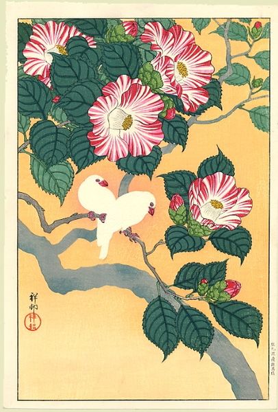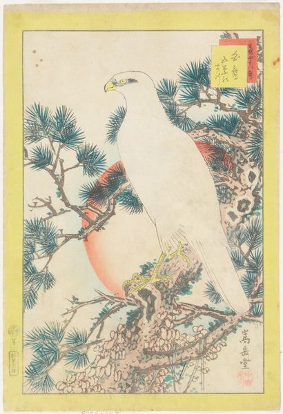 This is "Pink Parrot on Rock," a woodblock print made in Japan around 1850-1860 by Nakayama Sūgakudō. Notice how the vertical format and the careful arrangement of elements—the vibrant pink parrot, the dark, twisting rock, and the delicate blossoms—create a sense of dynamic equilibrium. The composition is structured around contrasts. The parrot, rendered in warm pinks and reds, perches on a rock depicted in cool blues and grays, which creates a visual tension. Look closely at the parrot's feathers; they have a soft, textured appearance achieved through meticulous carving and printing techniques. In contrast, the rock is defined by bold, angular lines that suggest solidity. One might interpret this as a reflection of broader aesthetic and philosophical concerns in Japanese art of this period, where the natural world is idealized. The print invites us to contemplate not only the beauty of the parrot but also the underlying structure that supports its visual presence.