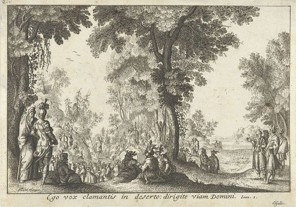 Theodoor Koning created this print in 1788, depicting a historical meeting using etching and engraving techniques. At first glance, one notices a carefully constructed composition, with lines and forms creating a structured view of an encounter. The architecture and trees act as framing devices, drawing our eyes to the central figures. The use of hatching and cross-hatching not only defines the shapes, but also creates depth and texture. This image, beyond its illustrative purpose, engages with ideas of representation and power. It’s a semiotic game, using visual cues to communicate status, decorum, and historical narrative. The print invites us to analyze the visual codes that governed its creation and reception. Ultimately, it is a structured ensemble of lines and shapes designed to convey meaning, but open to our interpretations across time.