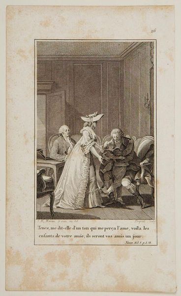 Curator: This is Jean-Louis Delignon's engraving, whose full title reads: "Then, reaching for me with emotion, he pressed me to his heart and said, 'Friend, I read in the . . .'," dating to the late 18th century. Editor: It’s a striking image. The stark contrast and tight composition create an immediate sense of tension and suppressed emotion. Curator: The scene depicts a moment of intense male intimacy, a reflection perhaps of Enlightenment ideals of friendship and sensibility. It's reminiscent of literary scenes exploring male relationships beyond the traditional bonds of family. Editor: I'm drawn to the way Delignon uses line and shadow to emphasize the figures' embrace. The almost claustrophobic setting focuses the viewer's attention on their connection. Curator: Indeed, and considering the social context, one can explore how such depictions navigate or challenge the prevailing norms around male affection and societal expectations. Editor: It certainly invites questions about representation and the coded languages of emotion in that period. Curator: Precisely, this work highlights the complex negotiation between personal feelings and public expression that characterized the era. Editor: A potent reminder of the enduring power of art to capture fleeting moments of human connection through form and context.