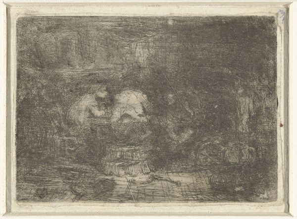 Editor: Here we have Jean-Baptiste Carpeaux's "The Death of Ananias," an oil painting made between 1869 and 1872. It definitely evokes a sense of chaos and darkness. What sort of underlying themes do you see emerging from this scene? Curator: Notice how the artist uses light and shadow – or rather, the dramatic contrast between them? In art, particularly during Carpeaux's time, this technique – chiaroscuro – wasn't merely about aesthetics. It served as a potent symbol, right? Editor: A symbol for... what exactly? Curator: Think about the biblical narrative. Ananias lied, betrayed a sacred trust. So, ask yourself: what does darkness typically represent in cultural memory? And conversely, what about light? Carpeaux masterfully employs those pre-existing associations to heighten the moral and emotional impact of the story. The people cloaked in shadow, perhaps represent their lack of understanding? Editor: That makes sense. And the brighter figures could be seen as the truly righteous ones. So, this play of light isn’t just a visual effect; it’s deeply rooted in symbolism, influencing how we, even today, respond to the artwork's message? Curator: Precisely. It speaks to the enduring power of visual language in shaping cultural and religious understanding. How do we learn to think about death by the way this artist represents it? Editor: I never thought of the technique as integral to the artwork's story. This really expands my understanding of history paintings!