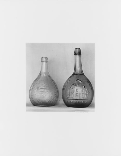 Curator: Here we have a black and white photograph of three glass flasks, attributed to the Keene Marlboro Street Glassworks. These date back to the period of 1820 to 1830. They’re currently held in the collection of the Metropolitan Museum of Art. Editor: Three ghostly siblings lined up for a family portrait. There’s something charming about these, even in black and white—like little transparent ghosts holding forgotten spirits! Curator: Flasks like these were common items in the early 19th century United States. Keene Marlboro was a significant glass producer and its flasks would have circulated widely. Notice the motifs molded into the glass. Each design served a different purpose. Editor: Yes, I see the variety in design! The first is more delicate and curvaceous—with that fluted fruit motif. The other two are almost blocky and solid. In one, is that a masonic emblem I see? What were these flasks intended for exactly? Medicine, liquors? Curator: Exactly! Many of these would have contained alcohol, like whiskey, and might have been brought to political rallies. Consider the third flask which depicts clasped hands, a symbol of unity, surrounded by stars, almost like an early proto-nationalistic symbol of America. Their survival offers insight into the popular imagery of the time and social customs surrounding alcohol consumption. They weren't precious objects; rather functional pieces shaped by daily use and popular iconography. Editor: It's amazing to consider they are everyday vessels carrying potent symbolism. So, something people probably threw around without a second thought now is speaking to us from a different dimension. It makes you think about what unassuming object today is charged with symbols and might someday communicate who we were as people. Curator: Precisely. Flasks offer tangible evidence of social drinking rituals, democratic engagement, and the emerging aesthetic vocabulary of a young nation, things that a simple glass photograph is unable to deliver. Editor: Very well said! I now regard them with a bit more reverence. Ghosts they may seem, but they still hold quite the social charge!