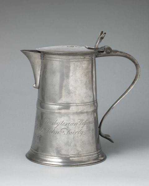 This is an anonymous milk jug, made of porcelain. Its sleek, white surface immediately strikes the eye, punctuated by the gleam of delicate gold trim. A painted portrait of Abraham Valentijn, framed in gold, lends an air of formal dignity. The jug's cylindrical body contrasts with the angular spout and handle. Consider the interplay between utility and representation. Is this an attempt to elevate a quotidian object to the status of art through the application of portraiture? The presence of the portrait invites us to ponder the relationship between the individual and the object, the personal and the mass-produced. This juxtaposition challenges fixed meanings and opens up new ways of thinking about domestic space, perception, and representation. We are left to question the inherent value we assign to an object, based on its aesthetic qualities.