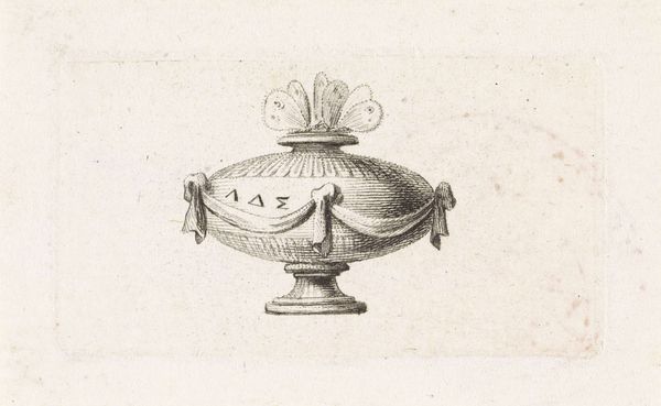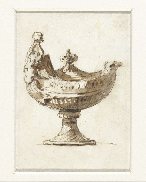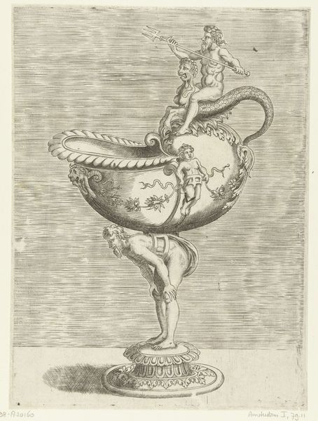Curator: This delicate engraving, crafted by Hendrik van der Borcht II between 1614 and 1654, depicts an ornate bowl resting on a low pedestal. The most striking detail is the handle—shaped like a playful mermaid figure. What are your initial thoughts on this piece? Editor: I find it captivating, this vessel seems suspended between the everyday and the mythological. There's something subtly subversive in the melding of the mundane bowl with that overtly allegorical mermaid handle. It poses questions about function versus symbolism, domesticity against broader societal power structures. Curator: Indeed, its creation coincides with a period of immense global trade, specifically maritime activity. Examining this, the artist used an engraving to create multiples from the primary object—expanding the audience with newly emerging economic patterns. Editor: Absolutely. And beyond trade, it also brings up conversations of gender, and of nature subjugated for domestic convenience, doesn’t it? I see the mermaid itself—a hybrid creature— as embodying the era’s uneasy relationship with ‘the other.’ Curator: I agree; that blending reflects contemporary social hierarchies. Consider the material realities—who would have commissioned and used this kind of object? It certainly points towards wealth, probably acquired through, yes, those globalized trade systems we touched on. It brings art into a setting of upper class labor. Editor: Yes! We have this image acting as documentation and promotion simultaneously. It gives the object greater reach than its physical footprint could have had, extending its influence far beyond its material limitations or presence in a private collection. I find it significant, too, that such craftsmanship would go into something ‘domestic’. Curator: The image captures an object of everyday use imbued with immense symbolic value – echoing the era's fascination with blending classical allegories with the realities of a burgeoning merchant class. Editor: Exactly. Thinking about contemporary applications of identity, how do such representations resonate, challenge, or reinforce the notions of otherness then, and still even now? Curator: Pondering on process, context, and material echoes... the print provides such an abundance of perspectives! Editor: Agreed—a surprisingly complex intersection unveiled by what initially appeared as a simple object of display!