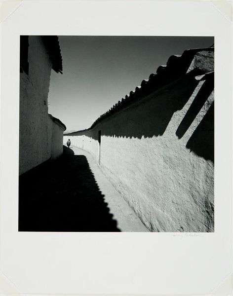 Curator: Harry Callahan's "Barbara, Switzerland" captures a young girl dwarfed by the imposing architecture of a Swiss alleyway. The print measures roughly 22 by 34 centimeters. Editor: My first impression is one of stark isolation. The darkness is so pervasive, it almost feels claustrophobic. Curator: The image evokes questions about power dynamics in urban space. How does the built environment shape the experience and agency of young women? Editor: I’m struck by how the stark contrasts emphasize the subject's vulnerability. The shadows feel almost allegorical, like she is navigating the underworld. Curator: Callahan's work often challenged mid-century societal norms; consider the post-war pressure on women and the restrictions placed upon their mobility within society. Editor: The light at the end of the alleyway, it's such a classic symbol of hope. Maybe this girl is walking toward it. Curator: It underscores how art can be a lens for interrogating the intersections of gender, space, and societal expectations. Editor: Absolutely, it's a potent reminder of the symbolic weight even seemingly simple photographs can carry.