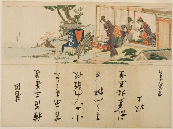 Curator: What a fascinating snapshot of leisure. The texture of the paper itself feels integral to the scene's effect, almost like rough, handmade stationary. Editor: Indeed. We're looking at "Cherry Blossom Viewing during the Genroku Period," a woodblock print from around 1830 by Toyota Hokkei. It depicts a group of figures enjoying the transient beauty of the sakura. What’s your read of this piece as a cultural artifact? Curator: For me, it's interesting to consider this as a mass-produced item, likely created within a complex workshop system, making a leisured activity accessible as a consumable image for a wider audience. It invites reflection upon class dynamics; the figures depicted and the labor involved in the print’s manufacture exist in sharp contrast. It highlights the societal value placed on certain kinds of leisure activities in 19th-century Japan. Editor: That’s a sharp reading. Hokkei clearly renders a certain class of people – note their fine robes, the entourage bearing what appear to be musical instruments or picnic supplies. The setting itself also matters: carefully tended gardens weren't accessible to everyone. Art in this time began to be used more and more often as a means to demonstrate your own values, even through the artworks that you choose to obtain, share, or destroy. How are societal changes impacting how these works circulate? Who controls which images persist through the passage of time? Curator: Precisely, it all hinges on access. The cost of these prints would have placed them within reach of the merchant class, who sought to emulate aristocratic pastimes. The act of viewing, and perhaps even collecting, such images was performative, a means of signalling one's aspirations. It’s an fascinating material study of cultural desire and production, made accessible through this specific printing process. Editor: And that desire fueled a booming industry, shaping artistic styles and themes. Hokkei was working within established conventions, appealing to contemporary tastes while also reinforcing existing social hierarchies. Curator: Understanding this circulation, how it reaches both the affluent collectors and lower artisans, sheds a vital light on how meaning and taste were manufactured. Thank you for expanding my knowledge on art consumption, looking at the broader landscape of this imagery, that it's not merely something seen but deeply valued within the social structure of the day. Editor: It goes to show, that by engaging with cultural history, it enriches how we experience and interpret this visual record from the past, appreciating art is a cultural act in itself.