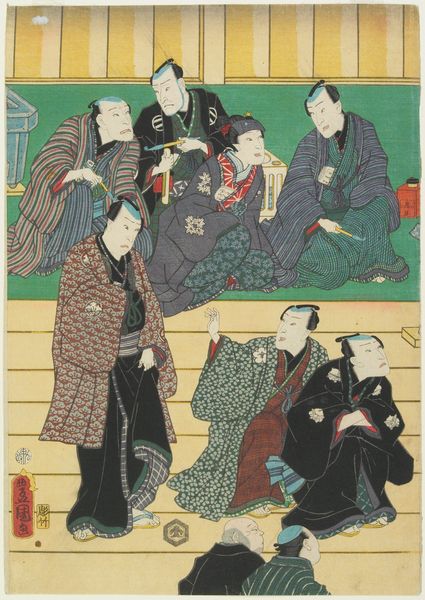 Editor: We're looking at "The Ten Great Disciples of Confucius," a woodblock print from around 1828 by Yashima Gakutei. It feels so densely packed with figures and detail, almost like a meticulously arranged puzzle. What do you see as its most compelling element? Curator: The most striking feature is certainly the composition itself. Note how the artist uses a cluster of figures to create a pyramidal structure. This directs the viewer's eye, while also presenting a complex interplay of line and form. What effect does the flatness of the picture plane achieve? Editor: It gives it a sort of stylized, almost symbolic feel, doesn’t it? Less about realistic representation and more about...arrangement? Curator: Precisely. The use of line, particularly in delineating the figures' robes and facial features, is incredibly deliberate. Gakutei focuses on clean, elegant lines to define form and to express texture through these. Consider, too, how the color palette reinforces this impression. Editor: You mean the limited range of colors? It does make you focus on the shapes and lines even more. It seems almost graphic in a way, but also refined because of the gentle colors. Curator: The color selection highlights the essence of each form. It reinforces the emphasis on two-dimensionality. Do you think that a greater use of modeling and shading would alter the artwork's impact? Editor: Absolutely. It would pull it away from being about pure form and line and into more realism, probably detracting from the patterns the print makes. Curator: Agreed. Through a focused manipulation of form, line and colour, this print delivers a fascinating study of visual composition. Editor: I see the image so differently now. Thank you. Curator: My pleasure. Considering such features enhances appreciation.