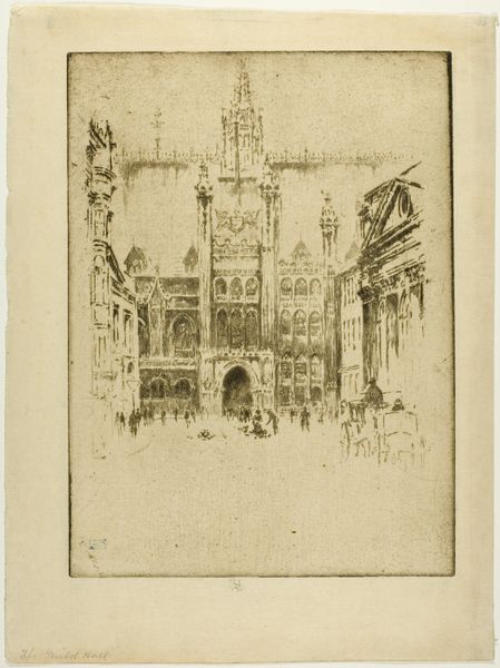 Editor: This is Joseph Pennell’s "Flower Market and Butter Tower, Rouen," an etching made in 1907. I’m struck by the contrast between the intricate, almost oppressive architecture and the bustling market scene below. It feels like a study in power structures, maybe? What do you see in it? Curator: Absolutely. The architectural backdrop—the “Butter Tower,” ironically funded by dispensations to eat butter during Lent— looms over the market, literally and metaphorically. How does Pennell’s choice to depict this specific locale during this specific time speak to the socio-political realities of early 20th-century France, on the cusp of major societal shifts, and what role might class play here? Editor: Hmm, I guess I hadn't thought about it in terms of class. Are you saying the tower represents the established church, literally overlooking the everyday lives of ordinary people in the market? Curator: Precisely. And consider the Impressionistic style. Instead of precise details, we get a fleeting, almost dreamlike quality. Does this blurriness romanticize or critique the scene, and whose perspective might be represented here? Perhaps, a tourist’s gaze seeking an ‘authentic’ experience? Editor: I see what you mean. It’s easy to get lost in the pretty image without thinking about who has the privilege to perceive it that way. It seems like the beauty is almost a veil over some deeper power dynamics at play. Curator: Indeed. Recognizing this intersection of aesthetics, history, and social critique helps us unravel the complex narratives embedded in seemingly simple cityscapes, prompting us to question whose stories are being told, and from what perspective. Editor: Wow, I will never look at an Impressionistic cityscape the same way again. I will keep in mind the intersection between esthetics and power in similar artworks going forward.