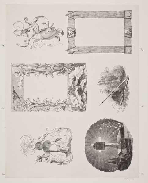 This is H. C. Henneberg's compilation, "Otte træsnit efter J. Th. Lundbye. Medlemsblad fra Den Danske Radeerforening," a woodcut print, whose date is currently unknown. The composition is structured as a grid. The delicate line work creates miniature scenes, each a small world rendered in shades of grey and white. The arrangement invites our eye to wander. Each image is self-contained. These vignettes depict rustic life and figures, such as livestock and a child learning to draw. The interplay between positive and negative space, or what is there and what isn't, defines the forms. This construction draws attention to the medium itself: the stark contrast of the woodcut. The scenes presented offer a glimpse into a world of pastoral simplicity. They subtly engage themes of education, labor and rural existence. Ultimately, the arrangement and delicate execution of these woodcuts, invites a contemplative assessment of both the scenes depicted, and the artistic choices. It’s a balance between form and content, prompting one to consider the relationship between representation and reality.