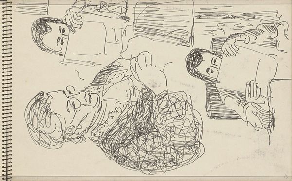 Curator: Welcome. We're looking at "Standing Man in Profile to the Right Beside a Lying Woman," a drawing, possibly from 1943, by Samuel Jessurun de Mesquita. Editor: It feels dreamlike. The figures seem disjointed, existing in separate planes almost. Curator: Mesquita's technique here is fascinating. Note the sparse, almost hesitant lines. The overlapping figures and planes create a spatial ambiguity, challenging conventional perspective. It also evokes surrealism, if not outright embracing it. Editor: There’s a palpable tension. The standing man is so stiff, presented beside the vulnerable, reclining woman, and another woman looming overhead. Considering Mesquita was a Jewish artist living in Nazi-occupied Europe, this evokes the fear of constant surveillance and loss of bodily autonomy. He was, in fact, murdered in Auschwitz. Curator: Certainly, the emotional weight is undeniable. However, formally speaking, it is a wonderful example of controlled chaos through line work, it’s the very essence of Modernist fragmentation. I notice, especially, how little attention he provides for their heads. Is it simply because there isn’t enough space? The overall effect is to force our eye from plane to plane, which destabilizes everything and creates movement. Editor: I can't help but view it through the lens of his biography. This could easily read as a comment on power dynamics inherent within patriarchal structures amplified by war, persecution, the constant threat against both mind and body. The ambiguity could itself be a means of coded resistance, representing a world turned upside down. Curator: While your reading undoubtedly adds a layer of meaning, it’s important to remember that even without the historical context, the drawing stands on its own as a compelling study in form and emotional tension. Editor: Perhaps it is both! It speaks to Mesquita’s ingenuity that, with only line and composition, he achieves so much: a technical mastery and a profoundly haunting statement about human suffering and the world in turmoil. Curator: A sobering piece indeed. Thank you for sharing your interpretation.
