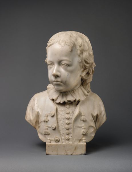 Curator: Here we have a bust of William Shakespeare, crafted around the late 18th century by the celebrated Wedgwood manufactory. It's rendered in ceramic, and exudes an air of neoclassical grace. Editor: Immediately striking. A somber mood hangs about it. He's looking downwards, quite pensive. The even, matte grey tone only reinforces that feeling. What do you think about that specific coloring in conjunction with the choice of subject, here? Curator: It’s quite telling, actually. Wedgwood was tapping into the burgeoning Shakespearean cult of the late 1700s. The monochrome finish lends it an air of classical antiquity, aligning Shakespeare with the great thinkers of Greece and Rome. It subtly elevates him, visually associating him with that lineage. Editor: I see your point about elevating Shakespeare's image. Still, the composition seems conventional, relying on the formula of a Roman portrait bust: the truncated torso, the gaze directed away. Were there conscious deviations from that structure? Curator: Note the precise details in his attire—the buttoned doublet, the meticulously rendered ruff. This is not just a man of letters; it’s a gentleman, elevated through craft and intellect. And look at how his gaze falls: it's the pose of deep contemplation, which makes the bust more immediate. You see an inward intensity that embodies what readers at the time believed Shakespeare was like. Editor: His melancholic demeanor could tie into Hamlet and all those pained heroes Shakespeare conceived, in effect! Curator: Precisely! The overall effect is one of gravitas, designed to inspire awe and respect. The Wedgwood factory created multiple busts to appeal to differing audiences; they come in a number of differing ceramic finishes, as well as a range of sizes that could befit any parlour, or any personal library. It ensured Shakespeare could become an accessible icon to wider sections of the emerging middle classes. Editor: That's really fascinating to consider—the intent to democratize art via widespread manufacture and create iconic emblems available to everyman. It puts this in an entirely different perspective. Curator: Indeed, understanding its social function allows us to fully grasp its cultural significance. It moves from being a formal rendering of Shakespeare's likeness to becoming something else entirely, namely a symbol of the changing face of Great Britain. Editor: Thank you—that’s altered my perspective in an unexpected way. I came in regarding its composition and execution; I am now intrigued by its wider resonance.