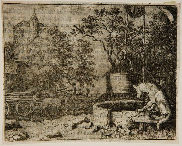 Editor: This is Allart van Everdingen’s “Reynard disguises as monk and distracts cock,” an undated etching. There's such a darkly humorous quality to it. How do you interpret the social commentary within this scene? Curator: This image offers a powerful critique of power structures, doesn't it? The fox, a symbol of cunning, dressed as a monk, speaks volumes about institutional corruption. It's a subversion of religious authority, wouldn’t you say? The rooster, representing the common folk, is easily deceived. How does this resonate with contemporary society, where appearances often mask true intentions? Editor: It’s a surprisingly timeless observation about authority and deception. I never considered how relevant it remains. Curator: Exactly! Art provides a lens through which we can examine societal power dynamics across different eras.