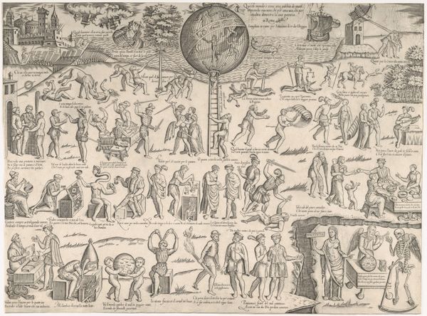 Curator: Immediately striking. An overwhelmingly intricate, busy scene teeming with miniature figures. It has the air of something both historical and satiric. Editor: You've pinpointed its complex nature well. This engraving, dating from somewhere between 1675 and 1720, is called “De Rogstekers van Weert, ca. 1650.” Though anonymous, it's housed at the Rijksmuseum. What’s interesting here is that it recounts an historical event with definite political and social undertones. Curator: It feels like we are peering into a carnival of societal disorder. The composition alone reflects this chaotic nature. There's very little in the way of classical ordering that normally prevails in history painting, no central protagonist, rather this flattened plane where we get lost in an interplay between actors. I also feel I see social criticism in their exaggerated expressions. Editor: Exactly. Look closer. This commemorates the Battle of Weert of 1648. The people of Weert, aided by local farmers, bravely repelled an attack by Spanish troops during the Eighty Years' War. Curator: So, what appears to be random chaos actually reflects a specific historical event viewed through, what I gather, amounts to propaganda of sorts. What might we interpret, then, from the absence of any recognizable heroes and how they appear less military in look. Note some look like clowns almost? Editor: Right. By representing the defenders of Weert with these exaggerated, even somewhat grotesque features, the artist conveys not necessarily literal accuracy but emphasizes the collective effort and the unexpected victory. They become symbolic, I feel, of Dutch resilience in a time of conflict. Moreover, by focusing on a seemingly minor battle, the print elevates the common person to a level of historical importance typically reserved for nobles. It challenges perceptions. Curator: So, we are looking at a visual rhetoric rooted in Dutch values—civic courage and resistance against foreign occupation! As we begin to tease this all apart, I think, it provides us insights into 17th century sociopolitical dynamics in the region and how history-writing can manifest in even anonymous art forms. Editor: Precisely. Even seemingly disorganized, busy imagery can speak volumes when situated in its context and through visual rhetoric!